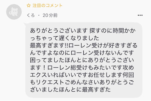 ありがとうございます。想像してたのと一緒です。見るの遅くなってすみません何か通知来てなくて、ローレン総受け最高です攻めのメンバーもセンス良すぎますガチでありがとうございます
