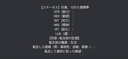 【ステータス】 STR(筋力):10 DEX(敏捷):11 INT(知力):13 WIS(精神):9 VIT(耐久):11 LUK(運):8 【背景/転生前の記憶】 転生前の職業・生活:大学生。17歳の頃に2歳年下の弟を病気で亡くしてしまい、それからはほぼ無心で生活していた。家族仲は良好だった。 転生した経緯:21歳の時に両親をも亡くしてしまい、耐えかねて風呂場で自殺を図る。これで解放されると思っていたが、何故か転生してしまったらしい。 転生して最初に知った絶望:自分は解放されなかったということ