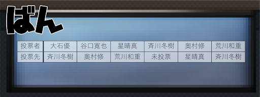 大石優 1票 谷口寛也 1票 星晴真 1票 斉川冬樹 1票 奥村修 1票 荒川和重 1票