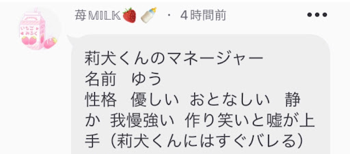 採用ありがとうございます!りいぬ君のマネージャーの方設定で、りいぬ君以外に嫌われている見たいのありましたよね?それって私達マネージャーも含みますかね??出来れば、仲間側と言うか全員と仲良くしたいなって~!