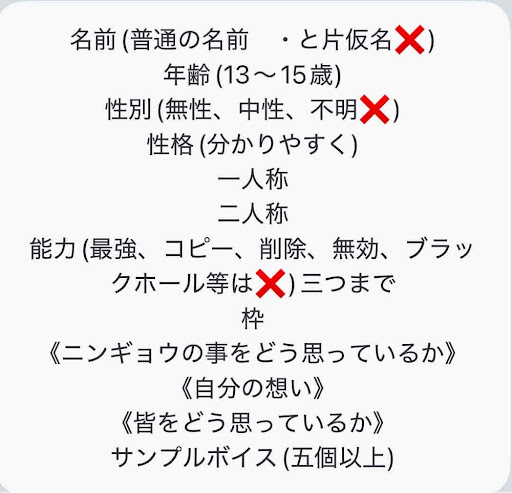 名前〘蓮凪荒川/レンナギアラカワ〙 年齢〘14〙 性別〘男〙 性格〘不憫、不運、狂人、時にまとも〙 一人称〘俺〙 二人称〘呼び捨て、君、あなた〙 能力〘爆死〙 〘ガチャを回す、だいたい爆死する。爆死した場合プリペイドカードを撒き散らし、自分とプリペイドカードが爆発する。 神引きをたまにする、神引きした場合攻撃力を馬鹿みたいに上げる。(ヴイルと同じ)〙 能力〘すり抜け爆死〙 〘体を半透明にし、壁をすり抜けたりできる。代償として次爆死する(ヴイルと同じ)〙 能力〘ヴィジョン〙 〘30秒までの未来を見通せる、クールタイム1分(パーフェクト・ヴィジョンの少し弱くなった版)〙 枠〘主人公〙 ニンギョウをどう思っているか〘敵。それ以外よく分かってなく、平和にはなれないかといつも考えている。ついでにお金貰えないかと考える〙 自分の思い〘神引きしたい!〙 みんなをどう思っているか〘仲間、友人〙