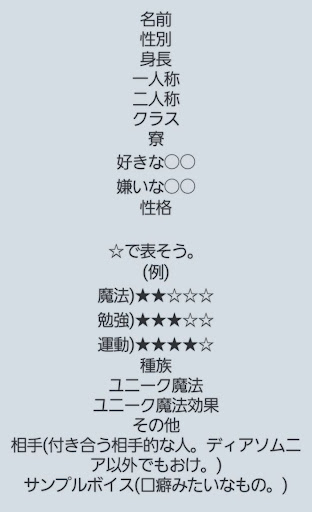 名前 ナナ・ラヴィール 性別 女の子 性格 敬語を使う ポーカーフェイス 無自覚毒舌 天然 年齢 1100(見た目小4) 身長 134cm 一人称 僕 二人称 さんずけ クラス 3のA 寮 ディアソムニア 好きな◯◯ 歌 ボカロ 皆 作曲 料理 ゲーム 嫌いな◯◯ うるさい事 ぶりっ子 虫 いじめ 魔法 ★★★★☆ 勉強 ★★★★★ 運動 ★★★★★ 種族 吸血鬼 ユニーク魔法 バット・ダイナマイト (コウモリの自爆) 効果 コウモリが現れて敵にくっついて3秒たてばコウモリが爆発する その他 オバブロしたことがある(それで無表情) 箒なしで飛べる(羽あるから) 🐿️🦟をしてる 相手 イデア サンプルボイス 「何?、、用がないなら話しかけないで」「、、、ボソッうるさっ」「、、、、あっ深く切りすぎた」「ふーん、別に興味ない」「、、、ふっ(笑)」