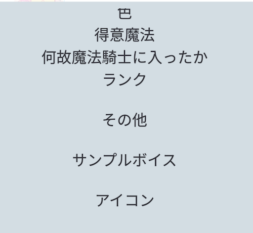 名前 フィリーナ・シャルロット 性別 女子 性格 自由奔放、元気、明るい 年齢 14 身長 151 種族 猫と人間のハーフ 好き 音楽、散歩、魔法 嫌い 虫、辛いもの 得意 運動、ジャンプ 苦手 勉強、人間関係 色 桜色 魔法 花魔法 理由 とある国の王女で、国を守 るため ランク S その他 世間知らずで本人は意識 していないが天然と思わ れることがある サンプルボイス 「みんな、いくぞ〜!」 「え?ヒラメとカレイって 同じでしょ?」