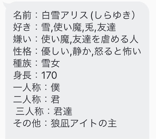 白雪ちゃんの方 美羽▶︎アリスちゃん 聖歌▶︎アリスさん 愛歌▶︎アリスちゃん 翔羽▶︎アリスさん 黒羽▶︎アリスさん 埜乃▶︎アリスさん アイト▶︎アリス