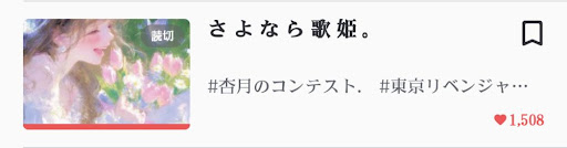 《杏月の作品》 このコンテストで唯一のJUJU夢! これはやられましたね。ノベルって文字だけで情景とか心情とか書かないといけないから難しいはずなのよ。なのにてまりんの作品は書籍を読んでるかのように素晴らしい表現力をお持ちなのでいつの間にか物語の世界に入り込んでしまう私✋🏻えっと、出版はいつでしょうか??((( それくらい素晴らしい作品でした! 改めて銀賞おめでとう!